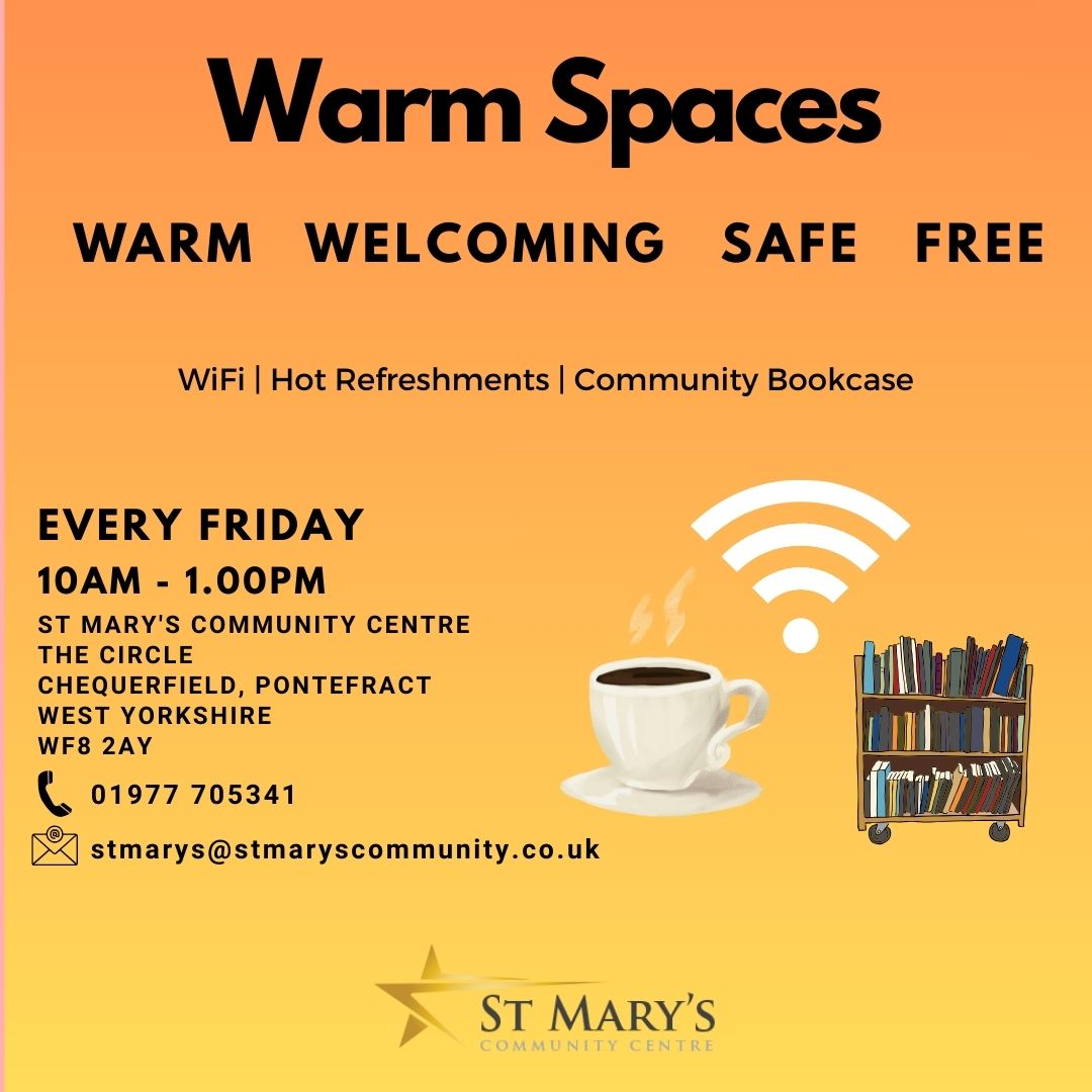 Warm Spaces at St Mary's Community Centre Citizens Advice Drop In Service Department of Work & Pensions Drop In Service Digital Drop In Session (Last Friday of every month) Please use the link below for more details on Help at the Hub provision: https://www.wakefield.gov.uk/cost-of-living-support/help-at-the-hub/